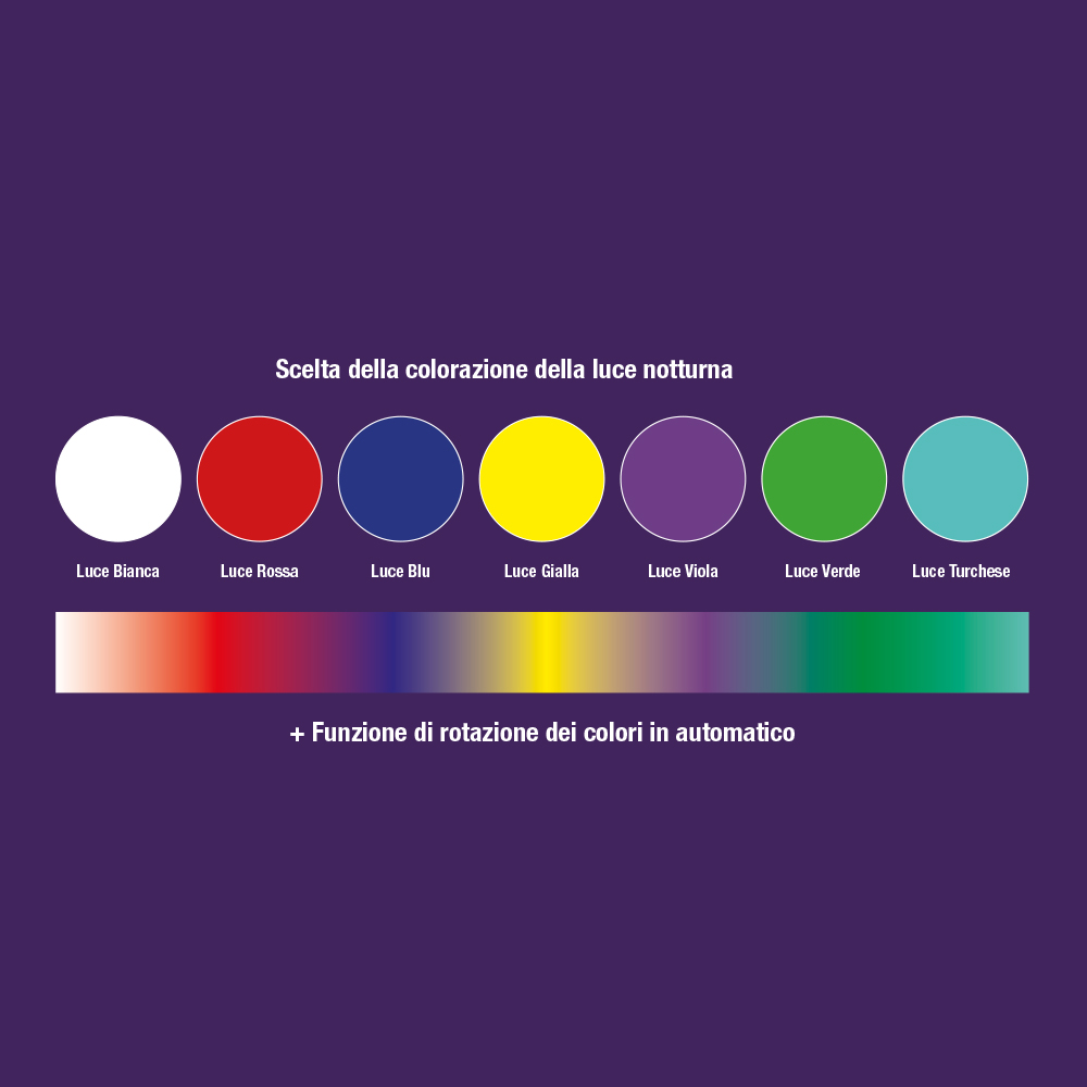 • Luce notturna selezionabile Bianca, Rossa, Blu, Gialla, Viola, Verde e Turchese + Rotazione automatica dei colori