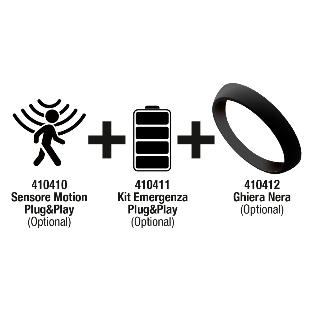 Il sistema è predisposto per l’installazione di un kit sensore radar programmabile, ideale per la gestione intelligente dell’accensione e dell’efficienza energetica, e di un gruppo di emergenza, che garantisce continuità di funzionamento e sicurezza anche in assenza di alimentazione.
